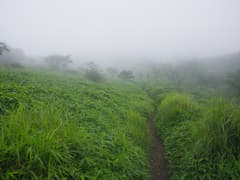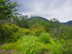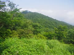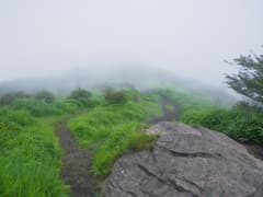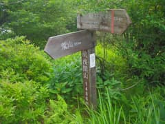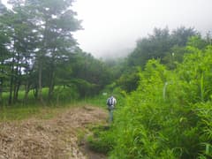 樹林内を緩く登り、展望のない「展望の広場」で左に箕輪への道を分ける。ゆるゆる登ると、途中で草原に出て、荒山を間近に仰ぐ。振り返れば鍋割山が見える場所だが(山行記録)、また霧がかかって見えない。荒山への最後の坂を登っていると、トレラン姿の若い女性2人組に追い抜かれる。すごいなあ。