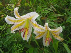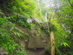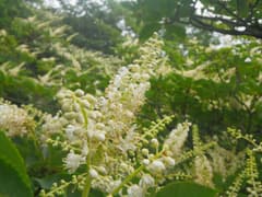 上空は低い雲に覆われ、見上げる斜面も途中から雲の中である。すぐにジグザグの急坂に取り付く。大きなヤマユリの花があり、今日は他にも夏の花が見られそうで楽しみ。植栽されている木にも白い花がたくさん付いている(後日調べてみたが、何の木か不明)。
