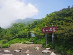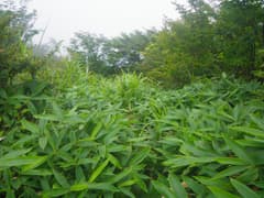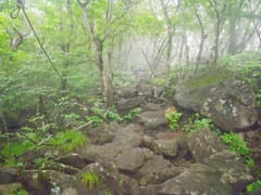 坂を上がると傾斜が緩んで、鍋割高原と呼ばれる笹原が広がる。眺めが良い場所だが、今日は残念ながら霧の中。再び樹林内に入り、溶岩がゴロゴロ積み重なる急坂の登りとなる。降りてくるハイカーさんと何組もすれ違う。坂を登りきると笹原の緩斜面に出る。鍋割山の周辺だけ雲が切れ始め、青空が覗いている。鍋破山前不動からの道を左から合わせ、開けた笹原の中をひと登りすると鍋割山の頂上に到着する。