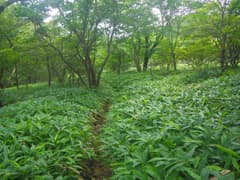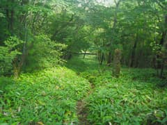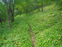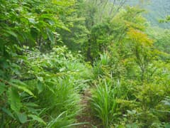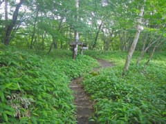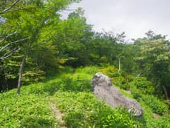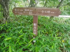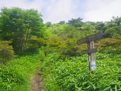 ここで右折して山腹を緩く下る。こちらも道型は明瞭。所々で草原が開け、行く手に牛石山を見下ろす。笹原を下って、荒山東面をトラバースする関東ふれあいの道に合流する。合流点の笹原の中には、前浅間山への道に×を記した看板や立入禁止の看板が倒れていて、やはり登山道として整備されたが、その後閉鎖されたらしい。確かに急坂ではあるが、特に危険な箇所はなく、なぜ立入禁止なのかは謎。