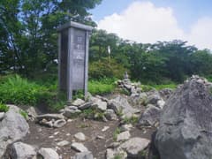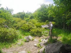 稜線を辿ると、「前浅間山 1686m」の道標のある小ピークに着く。ということで、ここが前浅間山の頂上。眺めはなく、静かな頂だ。件の道標は県内の高校3校が2008年9月に設置したもので、「←荒山0.6km 軽井沢峠0.5km→」と書かれている。正規の登山道が通じている(または、近年まで通じていた)ようだ。