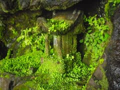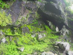 頂上では数組のハイカーさんが休憩中。上空は晴れているが、周囲の展望はガスの中。少し休んで、荒山に向かう。途中で岩屋に立ち寄る。ネット情報で知って、何度か行こうとしたが行きそびれていたスポットだ。通称人面岩という登山道脇の大岩の前から東側斜面を下る。木の階段道が続いているが、完全に笹に覆われていて、歩く人は多くないようだ。かなり下って少し左に寄ると、大きな岩屋がある。これはなかなか見事。庇から雫が滴り、岩屋の中は一面鮮やかな緑の苔に覆われている。屋根の前面に「秋葉山」の銘のある石祠と「十二山神塔」と刻まれた石碑が置かれている。