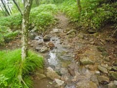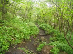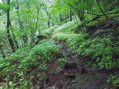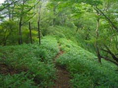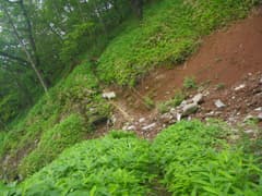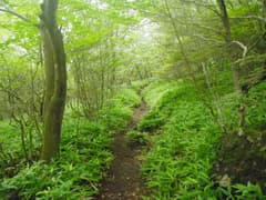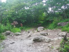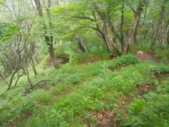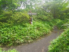 軽井沢峠から戻って、関東ふれあいの道を辿って荒山東面の急な山腹をトラバースする。丈の低い笹原と樹林の中の道で、しっとりとした雰囲気がある。途中に崩壊した涸れ沢を渡る個所があり、落石に注意。荒山・荒山高原分岐(東屋あり)に着く。