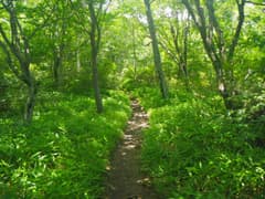 ここから荒山南面の緩やかな斜面を下り、沢を渡ると棚上十字路は近い。こちらにも東屋がある。「芝の広場」という開けた草地もあり、腰を下ろして一休み。あとは広い緩斜面をのんびり下る。