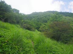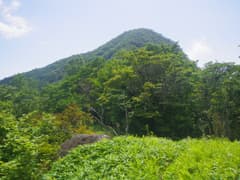 急降下が終わって、緩やかな登り返しとなる。相変わらず道型はしっかりしている。草地に出て振り返ると、荒山がグッと盛り上がって聳えている。