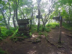 荒山頂上に登り着き、大きな石祠の前で一休み。緑深い樹林に覆われて、展望はない。先程の女性二人組に「こっちでも(荒山高原に)戻れますか」と南東尾根の登山道について尋ねられたので、「遠回りになるけど行けますよ」と答えると、そちらに下って行った。元気だなあ。