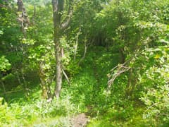 私はここから北東の尾根を下る。入口には特に道標の類はない。急で細い尾根だが、灌木を切り開いてしっかりした山道があり、赤テープもある。しかし、整備の手は入っていないようで、野趣があって面白い。左斜面下の谷底に通じる赤城道路を走るバイクの走行音が聞こえてくるのが玉に瑕。樹林に覆われて眺めはないが、一部の地点からおとぎの森や長七郎山が見下ろされる。