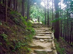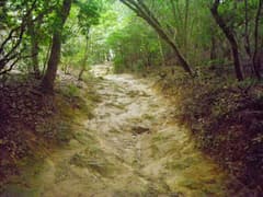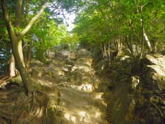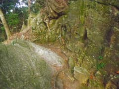 やや傾斜が増し、尾根を右から絡んで登ると、野猿坂の標識がある。二十一町目で砂利道を横断し、急坂を階段で登ると「見返り峠」の標識がある。杉、モチノキ、ツバキなど常緑樹に覆われた尾根を登ると大きな露岩が現れ、馬背岩(うまのせいわ)の標識がある。