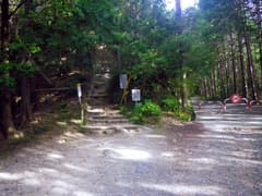 石段を登ると石鳥居があり、「これより砥鹿神社境内」の立て札がある。露岩の坂を登ると、途中に「山姥の足跡」の標識のある岩場がある。靴底でこの足跡を擦ると足が軽くなるそうで、みんなやっているのか、岩のそれらしい個所が磨かれて白くなっている。