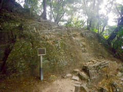 ここからしばらく露岩の道が続き、変化があって面白い。右側に東屋を見て登ると、日月岩(ひづきいわ)の標識のある露岩がある。日月の文字が刻まれ、弘法大師の書と伝えられているのだとか。