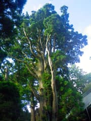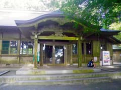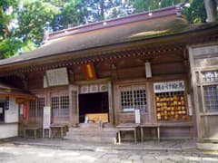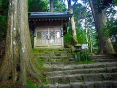 さらに石段を登ると、鬱蒼と茂る杉の巨樹に囲まれた砥鹿神社奥社に登り着く。由緒書きに依ると創祀は大宝年間(701〜704年)以前に遡り、昔より東海無双の霊域として尊崇されたとのこと。祭神は大己貴命(別称大国主命)である。社殿の裏手には樹齢約1000年、樹高30mの杉の御神木と参拝者休憩所・参籠所の古びた建屋がある。