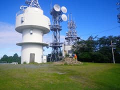 参拝者にとっては砥鹿神社奥社が頂上で、地元の常連らしきハイカーさんはお参りしたのちに戻って下っていくが、三角点のある最高点はもう少し先である。東屋の建つ広場を抜け、本宮山スカイライン(本宮山は、実は車で登れる)を歩道橋で渡り、短い急坂を登ると、開けた草地の広場に電波塔が林立する本宮山頂上に着く。