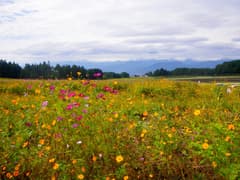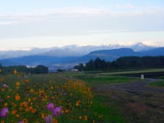駐車場には10台程の車があり、なんでこんなにたくさん、とビックリ。コスモスを見に来た人の車らしく(中には船ヶ鼻に登山中の人もいるかも知れない)、コスモス畑の周囲には大勢の人がいて、お花畑にカメラを向けている。早朝は薄暗かったのでそれ程でもなかったが、陽射しが当たるとなかなか綺麗である。