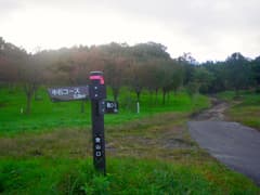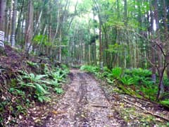 駐車場のすぐ上は結婚の森といい、園地に桜の木が植えられている。Y字路に「←牛石コース5.8km 楢水コース4.0km→」との真新しい道標があり、ここは右の楢水コースに入る。すぐに鹿除けフェンスがあり、開閉して通過する。林床にオシダが繁茂する杉林の中の作業道を緩やかに登る。