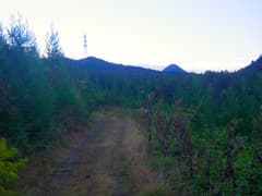 やがて植林されて間もない区画に入り、行く手に船ヶ鼻の頂に立つ紅白鉄塔や、稜線から頭一つ覗かせた円錐状の鈴ヶ岳の頂が見える。眺めが一時的に得られた後は、再び育った植林の中の作業道となる。道なりに歩けば迷いようがないが、頻繁に「山頂→」との道標があり、良く整備されている。また「熊出没注意」の標識もあり、確かに熊が出そうな雰囲気ではある。