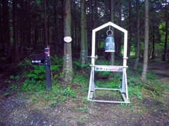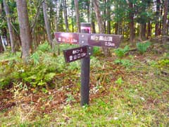 登山口から30分程で、半鐘のある分岐に着く。案内図に「幸福の鐘」と記載されている地点だ。なんで幸福?と思っていたが、実際には横板に手書きで「動物たちへの合図の鐘」と表示されている。これなら意図する所は明白で賛同できるので、備え付けの木槌で鐘を鳴らす。これで熊とパッタリ、なんてことが防げれば、お互いハッピーというものだ。