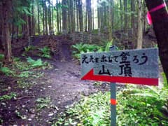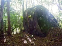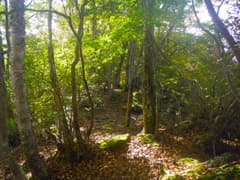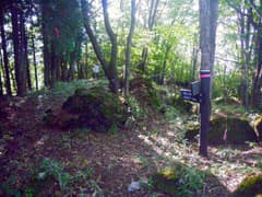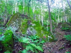 沢を渡り、杉林を抜けて自然林に入ると、苔むした巨岩がゴロゴロと散在する急斜面に取り付いてジグザグに登る。標高差100m程だが、山麓から眺めたときの印象からはこんな急登があるとは予期しなかった。“山”らしくて好ましい。
