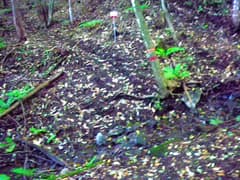 やがて「牛石」の道標があり、船ヶ鼻から降りて来た牛石コースに合流する。中華鍋を伏せたような岩が牛石らしい、腹が減ったし、林道を通る車もなさそうなので、牛石に腰掛けてお湯を沸かし、カップ麺で昼食にする。食べ終わった頃、ご夫婦がビニル袋2つにいっぱいのキノコを提げて、満足そうに林道を下って行かれた。