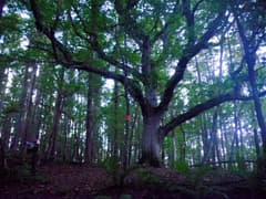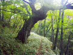 急斜面を登り切って台地状の広い緩斜面の上に出ると、「大楢の木」がある。推定樹齢は100年以上とのこと。太い幹が分かれして広がっていく枝振りがなかなか見事だ。
