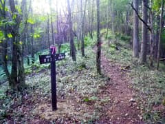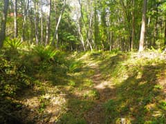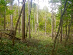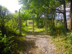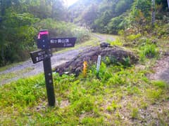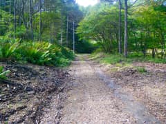 あとは登山口まで牛石コースを辿る。すぐにY字路となり、道標に従って左の作業道に入る。古い作業道で、路面がふかふかして気持ち良く歩ける。林床にはオシダが多い。浅い谷に沿ってゆるゆると下り、少し左に曲がると山腹をトラバースして深い谷を渡る。鹿除けフェンスを通ると結婚の森の園地に出て、登山口はすぐそこだ。