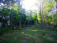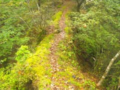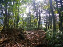 自然林に覆われた細い稜線を辿る。小さなアップダウンはあるがほぼ平坦で、苔むした露岩の多い稜線が続く。道型は明瞭で、藪もない。樹林に覆われているのであまり意識しないが、特に右側の斜面は結構急だ。良い雰囲気の道なのだが、北面道路からバイクの甲高い走行音が聞こえてくるのが玉に瑕である。