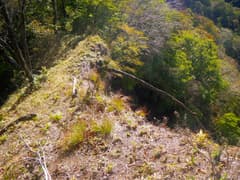 キノコ採りで山林に入るご夫婦と別れ、船ヶ鼻山の東面をトラバースして林道を歩く。『赤城の神』の地図では、この道の途中に「馬の蹄の滑った跡がある」という駒スベリ石が載っているが、それらしい石は見当たらない。林道工事でどけられて谷底、だろうか。