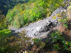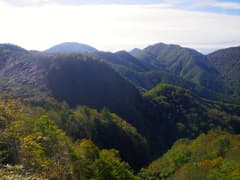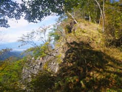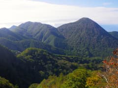 稜線を辿ると、突然、右斜面がごっそり崩落した地点に飛び出る。崩落は稜線の下を抉っており、稜線の縁に近づくと危険だ。しかし当然ながら眺めが開け、沼尾川の険しい谷を隔てて、円錐形のすっくとした山容が見事な鈴ヶ岳、それより低いがどっしりとした鍬柄山、五輪尾根、ちょっと頭を覗かせて荒山、地蔵岳の円頂が眺められる。