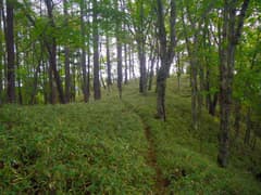 崩壊地を過ぎ、丈の低い笹原の稜線を緩く登る。1480m峰を越えると、左に分岐する道の痕跡がある。これが沼田通りの入口らしい。やはり、使われなくなって久しいようで、低い笹に覆われている。