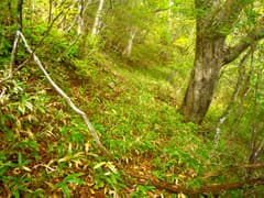 1480m峰の手前で沼田通りに入り、稜線から別れてピーク直下をトラバースする。丈の低い笹原に覆われて、最近歩かれている様子はないが、道型ははっきりしている。しかし、尾根を回ると道型が薄くなり、木の幹の赤ペンキを頼りに帯状の緩斜面を下る。