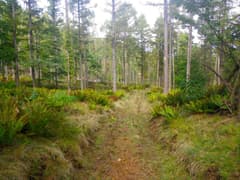 この破線路は緩斜面をうまく利用しており、なかなか合理的に拓かれた道であることがわかる。この緩斜面が「一ノカヤ原」で、昔はカヤ原だったのだろうか。現在はカラマツの植林帯となり、作業道も通じていて、往時を偲ぶべくもない。