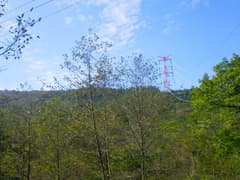 つつじ平から僅かな距離で牛石コースとの合流点に着く。船ヶ鼻頂上は右へ登ってすぐだが、左の目と鼻の先に船ヶ鼻の目印とも言える大鉄塔が立っているので、行ってみる。この送電鉄塔は東京電力東群馬幹線57で、高さ122mとのこと。鳴蟲山の132mには負けるが、見上げただけで肝が冷える高さである。