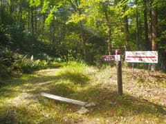 展望を楽しんだ後、緩く登って船ヶ鼻頂上に着く。こちらは樹林に囲まれて展望はないが、静かで落ち着ける雰囲気のある頂だ。真新しい道標が設置され、「船ヶ鼻山頂 1466m」「←赤城大洞 大沼尻まで 3.0km」「登山口(略)→」と記されている。一方、これから辿ろうとしている「←赤城大洞」への稜線の入口には「この先危険につき立入禁止」との新しい看板が立つ。なんか矛盾しているが、この先は昭和村は登山道を整備していないので自己責任でどうぞ、ということだろう(末尾の参考URLの記事によると、やはりそのようである)。