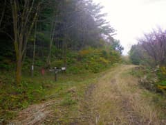 子双山から南東に下ると、肩に相当する平坦な平地がある。ここから僅かに左寄り下ると、小笹に覆われた雑木林の急坂の下りとなる。下り着いたところは笹原が広がる鞍部で、踏み跡を辿って緩く登り返すと地形図にも記載のある林道に出る。