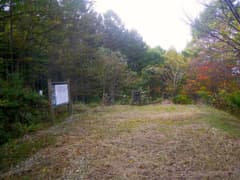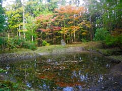 直進すると作業道は終点となり、矢筈山登り口がある。直進する山道を指して「鈴ヶ池へ」という道標があるので、ちょっと立ち寄ってみる。山道を下るとすぐに小さな溜池に着く。獣の水飲み場兼ヌタ場になっているようだ。水辺に鮮やかな紅葉があったので、来てみて良かった。