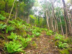 作業道終点に戻って、矢筈山への登山道に入る。現地の道標は「ヤハズ山へ」とカタカナ表記になっているが、これは矢筈が読めない小学生向けの配慮だろう。オシダが疎らに生えた杉林の急斜面に丁寧にジグザグを切って登山道が拓かれている。路面はあまり踏まれた様子がなく、蝶が舞う季節以外に登る人はそう多くなさそうな感じである。