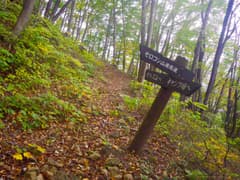 「鈴ヶ池へ」との道標に従って、右に分岐する未舗装の作業道に入る。入口には、この付近に生息するヒメギフチョウを保護するためのお願いの看板が立ち、登山道以外に立ち入らないことや、チョウの成虫・幼虫・卵を採らないこと、(幼虫の餌となる)ウスバサイシンやカタクリを採らないこと、等が書かれている。関東地方では珍しい貴重な蝶で、「赤城姫」と呼ばれ、春先の蝶が出現する時期には見に来る人も多いそうである。