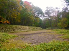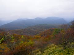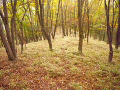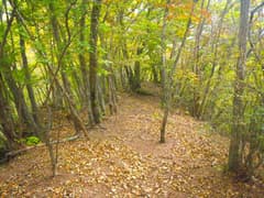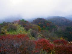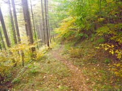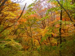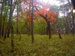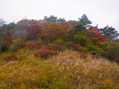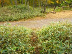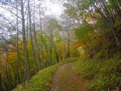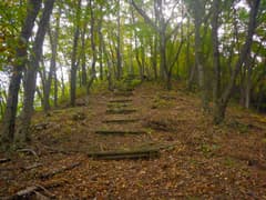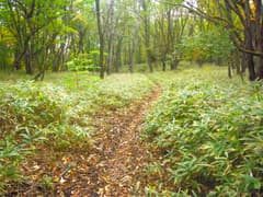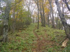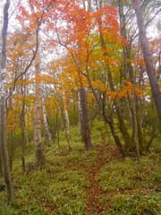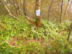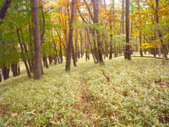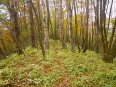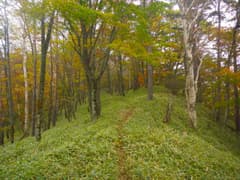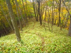 しかし、それにしても笹原の中の気持ち良い道が続く。山深く、聞こえる音といえば、鹿の鋭い鳴き声が時折。鹿さん、驚かせてゴメン。標高が上がるに連れて、鮮やかな派手さはないが、いい感じに色付いた木々も現れる。