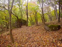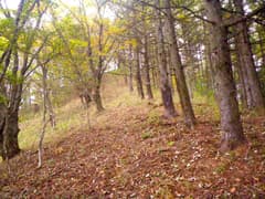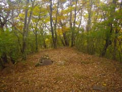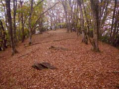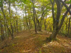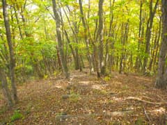 やがて自然林に入り、モロコシ山連絡道を左に分ける。小尾根上に出て登るとモロコシ山への登山道を左に分ける。道標があり、矢筈山頂上はその直ぐ先である。G氏山名標の他は何もない。雑木林に覆われて展望もないが、黄葉を透かして陽が差し込み、晩秋らしいカラッとした明るい雰囲気がある。