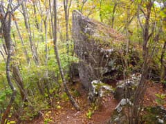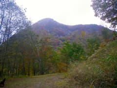 あとは登山道を下るだけだ。落ち葉に埋もれて道型がはっきりしない所もあるが、道標がしっかりしているので問題ない。右岸の少し高いところをトラバースして下る。左岸には、木の間越しになるが、子双山が高々と聳えているのが眺められる。巨石が山積する斜面の下を通り、カラマツ林に入る。山道から作業道になれば、程なく鈴ヶ岳登山口で林道に出る。矢筈山を眺めながら林道をのんびり下り、駐車地点に戻った。