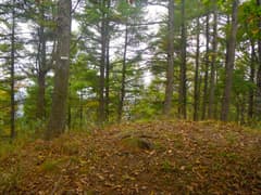 矢筈山から稜線を伝ってモロコシ山に向かう。雑木林の稜線を下ると、短いが痩せて急な区間があり、大岩を巻いて通過したり、小さな岩場を下る。鞍部からカラマツ林を登り、左から登山道を合わせるとモロコシ山の頂上に着く。雑木やカラマツに囲まれて、こちらの頂も展望はない。