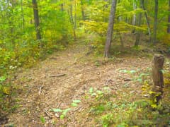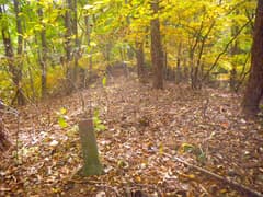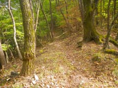 平坦な尾根を辿り、「山 六三ノ三一」と刻まれた石柱で右に折れる尾根に入る。落ち葉を踏んで進むと子双山との鞍部で、細い作業道が越える名無しの峠に着く。
