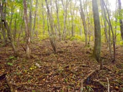 笹は精々膝下の高さで、登るに連れて低くなり、藪漕ぎの範疇に全く入らない。尾根の形がはっきりして来ると、どこからともなく現れた道型に合流し、あとはこれを辿る。多分、古の登路を通るものが鹿だけになって、道型が残っているのだろう。鹿さんに感謝。