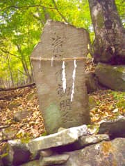 程なく林道は終点となる。古い木の標柱があり、辛うじて前山林道終点と読める、ここから小尾根上の明瞭な踏み跡を下ると、尾根の末端が鈴ヶ岳南回りコースの「清滝不動明王」の石碑のある地点で、ドンピシャで降り着く。石碑の背面には「明治廿弐歳五月吉日」の銘があり、基部から清水が湧き出している。