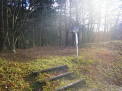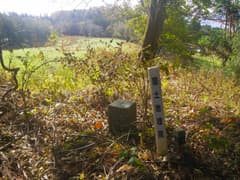 赤城西麓広域農道を横切って、さらに車道を登る。民家がポツポツ現れ、十二宮の社のある辺りが芳ヶ沢の集落だ。道標に従い、集落の外れの十字路を左折。浅い窪を渡って杉林の中を登ると道標があり、左に深山への道が分岐する。ここで関東ふれあいの道から別れて右に進むのが予定のルートだが、その前に気まぐれで近くの714m三角点に寄り道してみる。深山への下り口から左の杉林の中に入って少し下ると、耕作されていない畑地と杉林の境界に三角点標石(点名:芳沢)がある。まあ、マニア以外は来ない所であろう。
