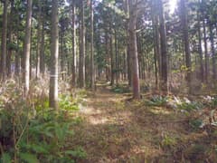 GPSから、設定した分岐点に接近したことを知らせるピッという音がして、左手の杉林の中を見てみると、入口が判りにくいが作業道が分岐する。ここが地形図に記載されている破線路への分岐点のようだ。この作業道を辿ると、真っ直ぐ緩く登って杉林を抜け、雑木林に覆われた尾根の上に出る。右側は緩斜面だが、左側は急傾斜で落ち込んでいる。