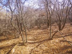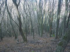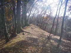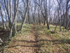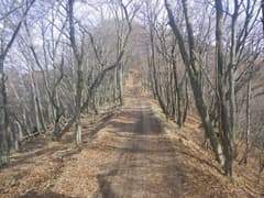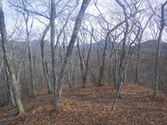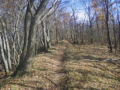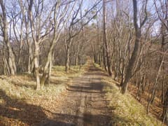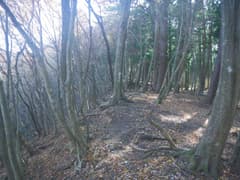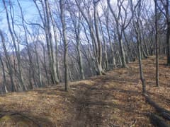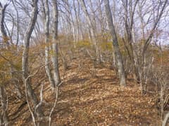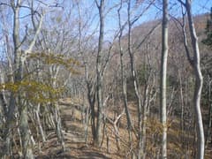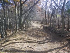 雑木林の尾根の緩い登りが続く。踏み跡の中には二輪の轍もあるから、オフロードバイクやMTB(マウンテンバイク)が走っているようだ。確かにそれ向きの尾根と思う。また、花窪林道はそちらの方面で有名という話もネットで読んだ。六道の辻でMTBのグループに会ったこともある。彼らは多分この辺りをダウンヒルしたのだろう。ただし、今日はここまでバイクや自転車、他のハイカーさんにも会ってなく、実に静かな山である。