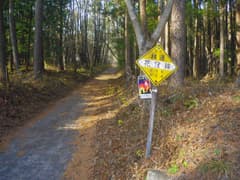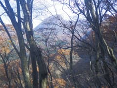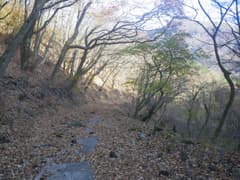 前回は雲が多い天気で、大箕山しか見えなかったが、今日は鍋割山の長々と横たわる山容もバッチリ眺められる。赤城道路へは旧道の花窪林道を下る。入口には立入禁止の看板がある。既に崩壊が始まっていて、簡易舗装の路面には落石が散乱し、落ち葉に厚く覆われている。歩くには良い道で近道にもなるが、そのうち完全に廃道化するだろう。
