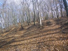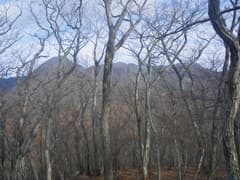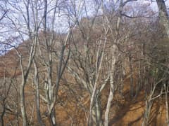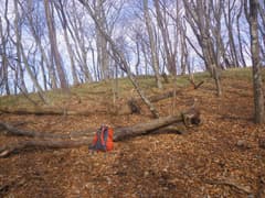 尾根上には明瞭な道はないが雑木林の下生えの藪はなく、道型や微かな踏み跡が断続して至極快適に歩ける。これはお勧めできる尾根歩きのコースだ。展望はないが、左手の木の間越しに鈴ヶ岳が終始眺められる。やがて尾根が広がって進路に迷うが、とにかく高い方へ登っていけば良い。文献によると、この辺りに「羽端の一本松」がある(あった?)そうだが、それらしい木は見当たらない。