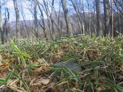 急坂を登りきると再び緩やかな尾根となり、丈の低い笹原の中に三角点標石を見出す。これが1163m三角点(点名:鎌石)で、『赤城の神』ではこの辺り一帯を丸山と称しているから、ここを丸山頂上としても問題ないだろう。ただし、頂上は東西に長く平らで、最高点はもう少し東にある。