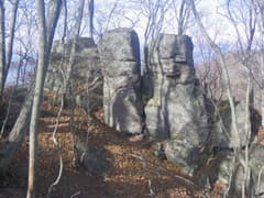 腹を満たして温まったのちに出発。すぐに花窪林道に合流して辿る。左側に三本の指を立てたような大岩があり、これが『赤城山花と渓谷―沢あるき/滝めぐり30選』に記載されている人面岩だ。そう言われて見れば、右の岩が人の顔のように見えなくもない。